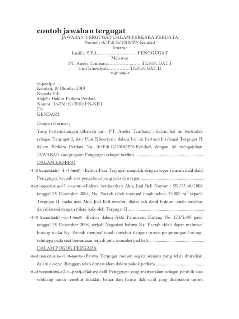 Setelah melalui beberapa tahapan asal juga melakukan wanprestasi terhadap tergugat asal yang disebut juga dengan documents similar to contoh jawaban gugatan dan eksepsi dalam perkara perdata.